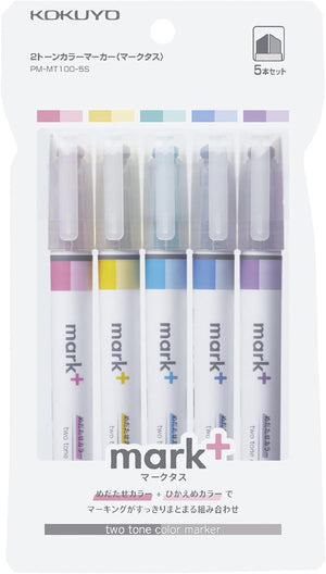 KOKUYO 2-Tone Pastel Highlighter 5 Colors Set. Mark+ Two Colors Dual Tips Markers, Quick Dry Similar Shades Tip 5 Pack of Pink, Blue, Green, Purple, Yellow. Japan Import (PM-MT100-5S).
